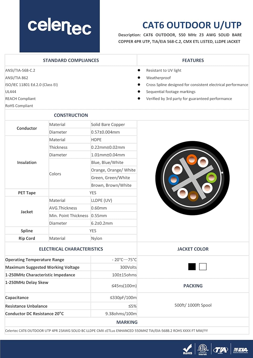 - RELIABLE OUTDOOR DURABILITY. When you need to run a high speed Ethernet cable outside, look no further than celertec for the best selection of Cat6 Outdoor cable. The outdoor cables are constructed with LLDPE jacket that withstand the elements such as UV, rain and temperature changes. Provides superior performance to PVC jacket in harsh environments.
