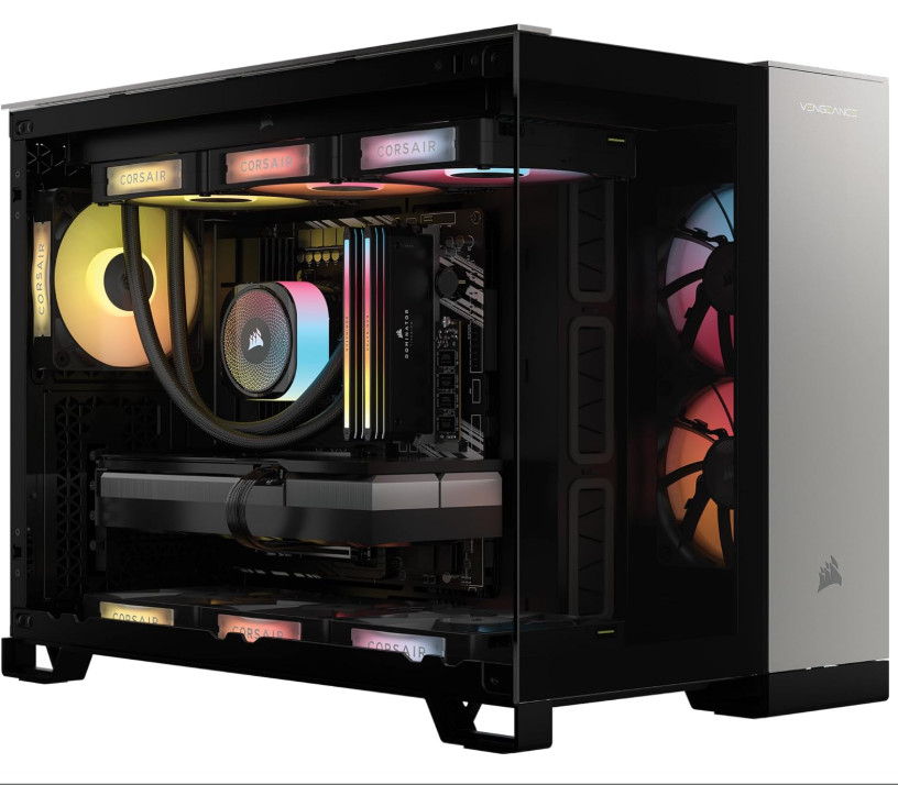 - CORSAIR iCUE LINK 2500X RGB Dual Chamber Case: Offers stunning views of your PC’s internals through tempered glass panels, along with impressive cooling performance from side, rear, roof, and bottom fans.