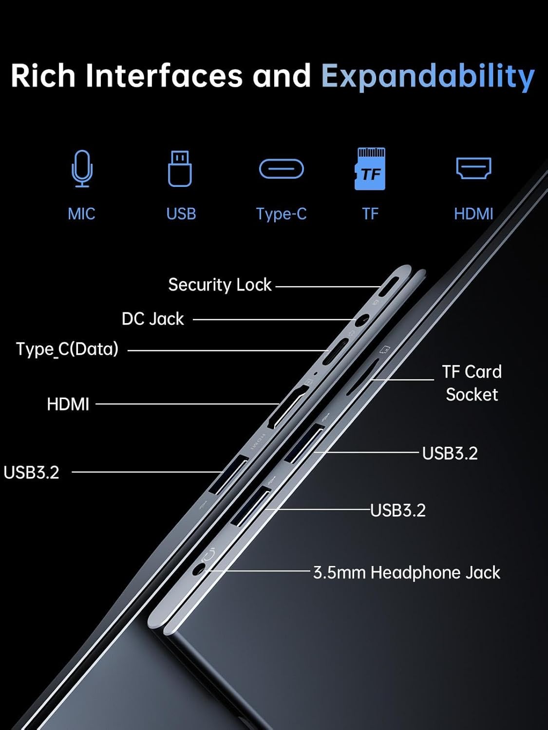 - 【Stay Connected Anytime, Anywhere】The LX15 laptop computer is equipped with a versatile array of ports, including HDMI Type A x1, USB 2.0 x1, USB 3.2 x2, Type-C (Data) x1, 3.5mm Headphone jack x1, 128GB TF Card Socket x1, and Type-C DC Jack x1. Lightning-fast 802.11ac WiFi offers download speeds up to three times faster than previous generations, while Bluetooth 5.0 ensures stable, reliable connections to all your wireless devices—whether you’re streaming, gaming, or working.