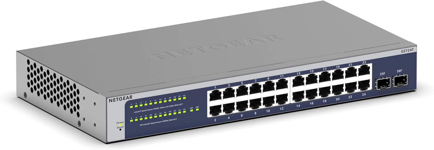 | Included Components | 24-port Gigabit Smart Switch (GS724Tv6), Installation guide, Power cord, Rackmount kit, Rubber footpads24-port Gigabit Smart Switch (GS724Tv6), Installation guide, Power cord, Rackmount kit, Rubber footpads |