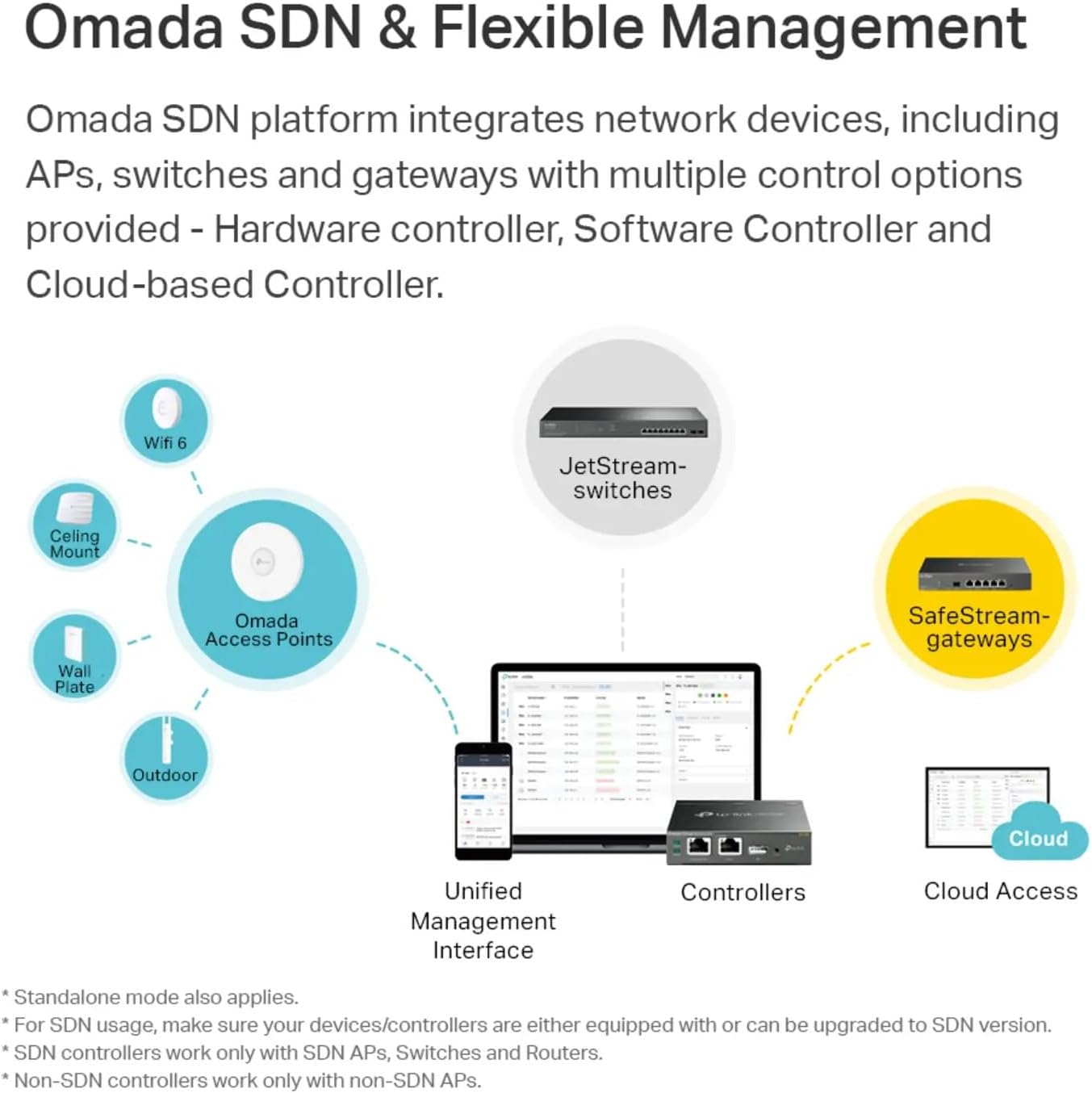 • 𝐈𝐧𝐭𝐞𝐠𝐫𝐚𝐭𝐞𝐝 𝐢𝐧𝐭𝐨 𝐎𝐦𝐚𝐝𝐚 𝐒𝐃𝐍: Omada’s Software Defined Networking (SDN) platform integrates network devices including access points, switches and gateways with multiple control options offered – Omada Hardware controller, Omada Software Controller or Omada cloud-based controller(Contact TP-Link for Cloud-Based Controller Plan Details). Standalone mode also applies.