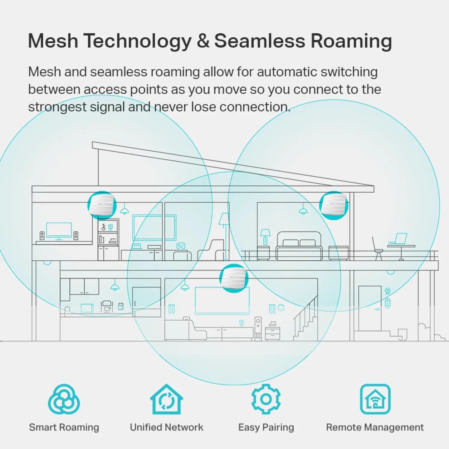 • 𝐀𝐝𝐯𝐚𝐧𝐜𝐞𝐝 𝐖𝐢𝐫𝐞𝐥𝐞𝐬𝐬 𝐓𝐞𝐜𝐡: Supports Mesh WiFi, Seamless Roaming(Omada Mesh and Seamless Roaming require the use of Omada SDN controllers), Band Steering, Airtime Fairness and Beamforming technologies.