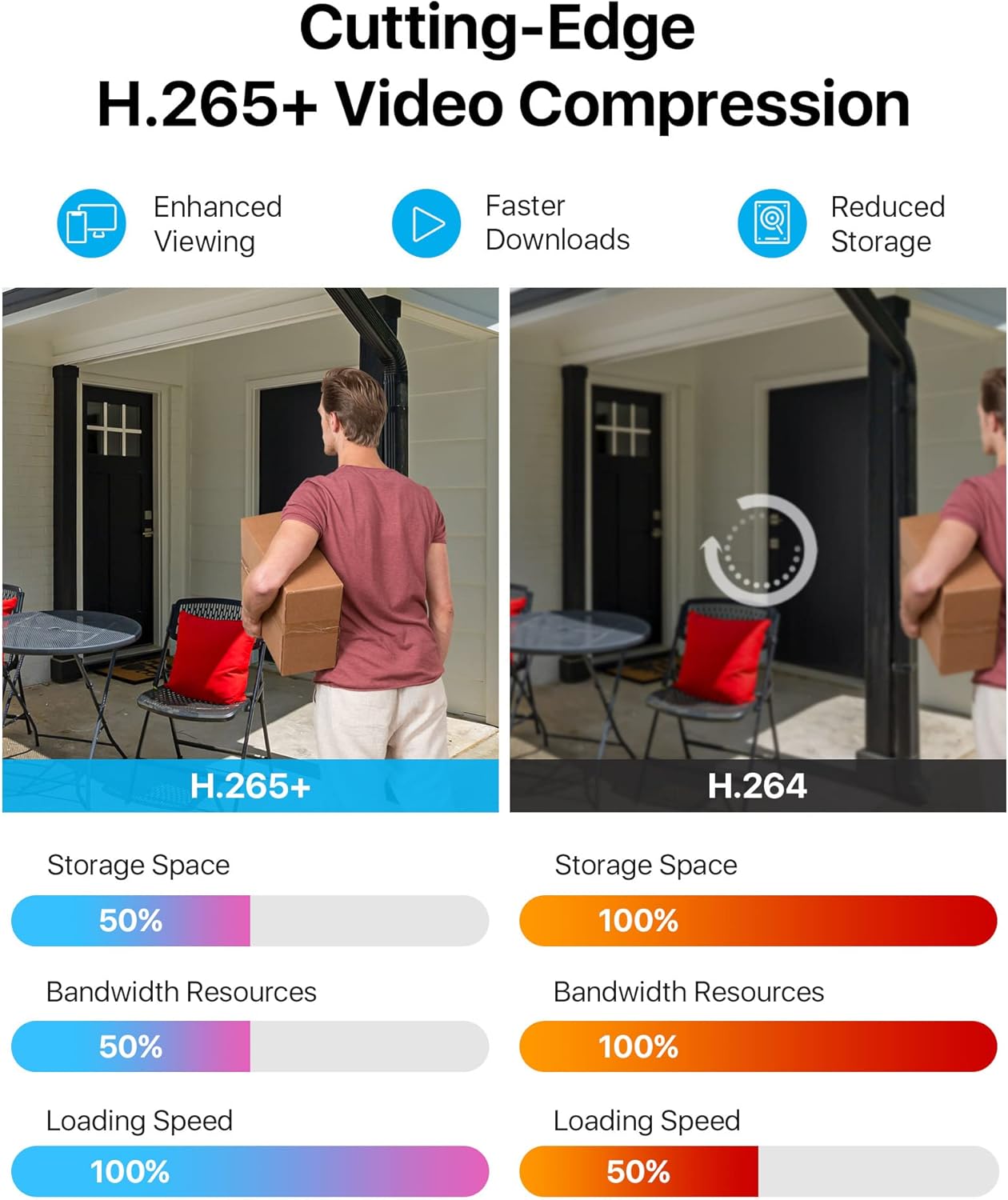 - (5). [ Advanced H.265+ High Efficiency Video Compression ] __ ZOSI self-developed H.265+ video coding technology extract features that focus on characteristics of the surveillance scenes for larger storage space and better image quality. H.265+ can further improve compression ratio on the basis of H.265 standard and save about 80% storage compared with H.264, and thus effectively saving storage resources and provides an excellent and smooth viewing experience.