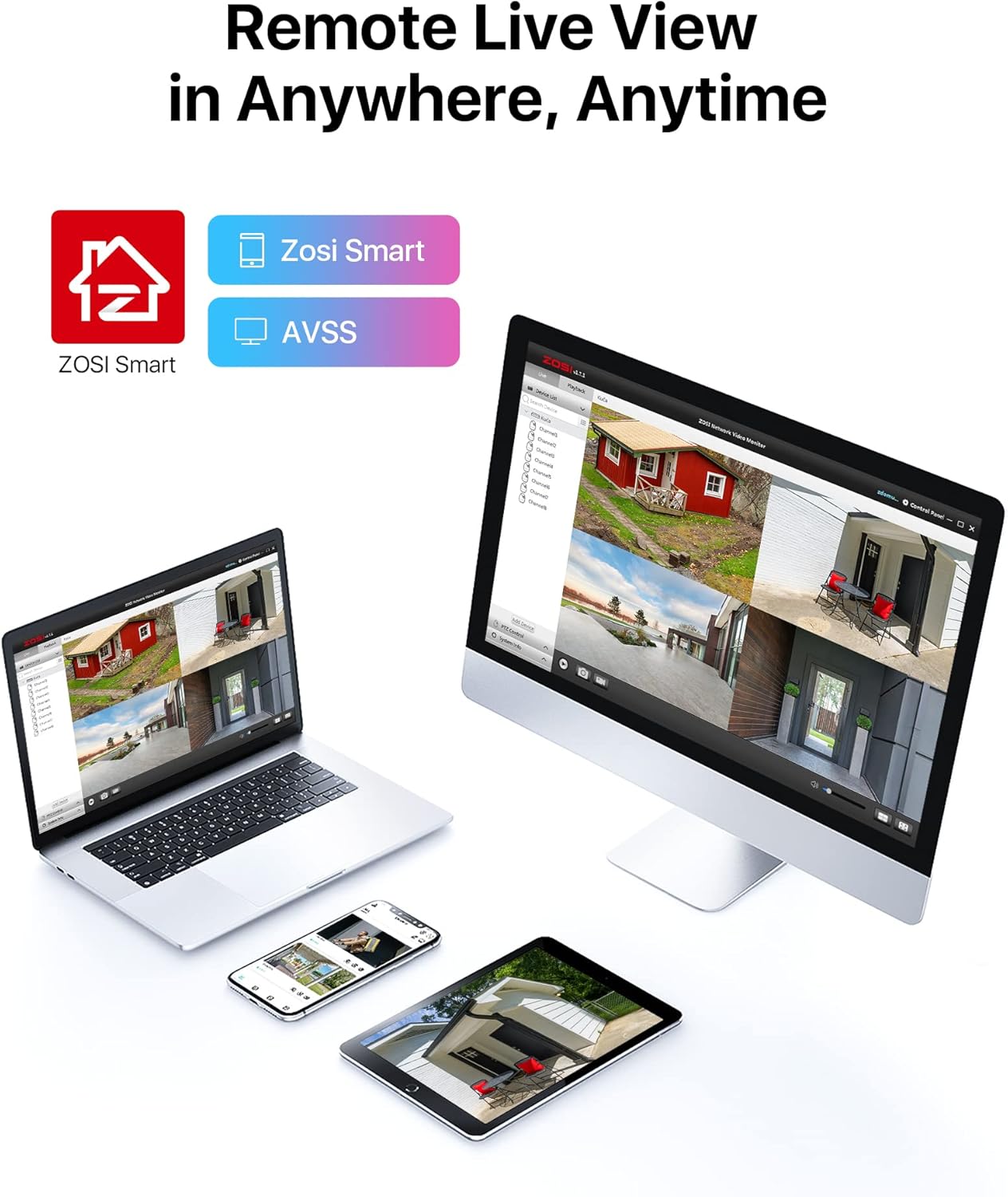 - (3). [ Local or Remote Access, Playback Anytime & Anywhere ] __ View and control your security system locally by connecting the system to a monitor without internet, or via free ZOSI Client software on tablet, PC, or via Smartphone APP (ZOSI Smart ) on mobile devices remotely.You can also playback significant evidence or funny videos records by searching different days, hours or minutes.
